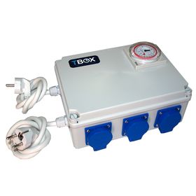 Está diseñado para soportar la carga de ocho accesorios de 600W. o diez de 400W. Incorpora una toma auxiliar de calefacción en la parte superior. Esta se activa cuando el resto de tomas están apagadas, lo que permite mantener, mediante un calefactor, la temperatura idónea de la sala. Características técnicas: Medidas: 241 x 180 x 95mm. Potencia máxima admitida: 8 accesorios de 600W o 10 de 400W. Potencia máxima toma auxiliar: 2.400W. Voltaje: 230V/ 50 Hz. temporizador analógico con maniobra mínima de 15 minutos. Protección IP40.